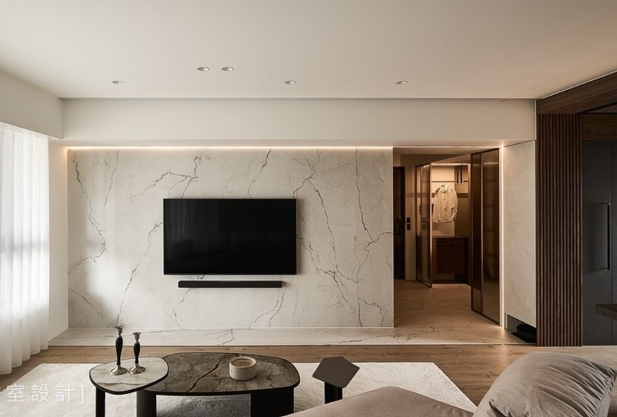 公領域採開放佈局,沉穩暖灰色為基調,電視牆鋪陳大器的義大利大板磚,點綴線燈勾勒現代光影脈絡,地坪溫潤木紋與牆面手作塗料的樸質相呼應,在細節間流露低調而精緻的工藝語彙。