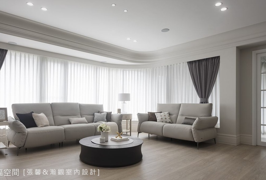 屋主夫妻曾居住數間房子,清楚自己喜歡簡單、乾淨的生活方式,因此公區氛圍淡雅,L型窗景臥榻區引光入室,以美式收框做隔間劃分客餐廳,既能修飾結構樑柱也創造大量收納空間,讓不喜歡看到雜物的屋主,可以輕鬆維持居家清爽。日子除了兩人相伴,也會時常和至親好友相聚一堂,掌握主空間的比例後,還能再規劃出兩間多功能室做為麻將間及遊戲室,讓退休生活在親友陪伴下更豐富滋潤。
