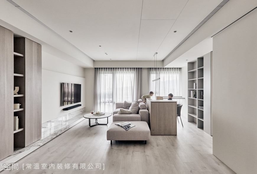 靠牆式的大書桌與窗邊景觀吧檯桌設置,