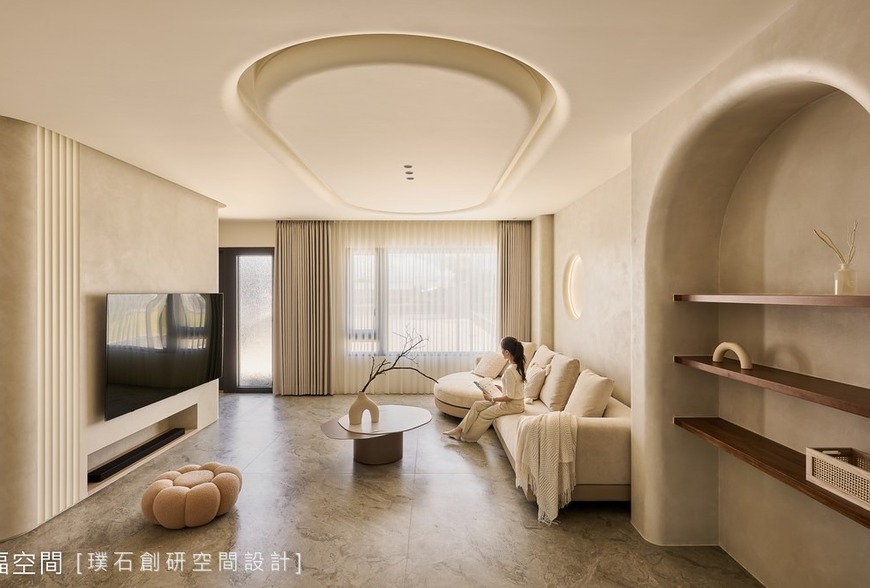 在玄關區域,設計師巧妙運用不同材質的磁磚和降板設計,創造出一個大落塵區,不僅讓來客可以輕鬆換鞋,還能有效避免灰塵進入室內。圓弧電視牆分隔了玄關與客廳,並引導流暢的回字型動線,讓空間感覺寬敞且舒適。壁龕的設計成為仛寂風的典型元素,屋主珍藏的藝品與回憶能在這些空間中得到展示與欣賞,為居家增添無形的文化氣息。