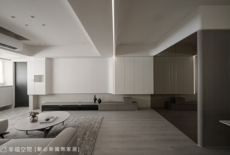 昀|現代風灰白色為基調,流動光線於牆與天花之間游移,弧形立面柔化界線,光影成為空間的筆觸。
