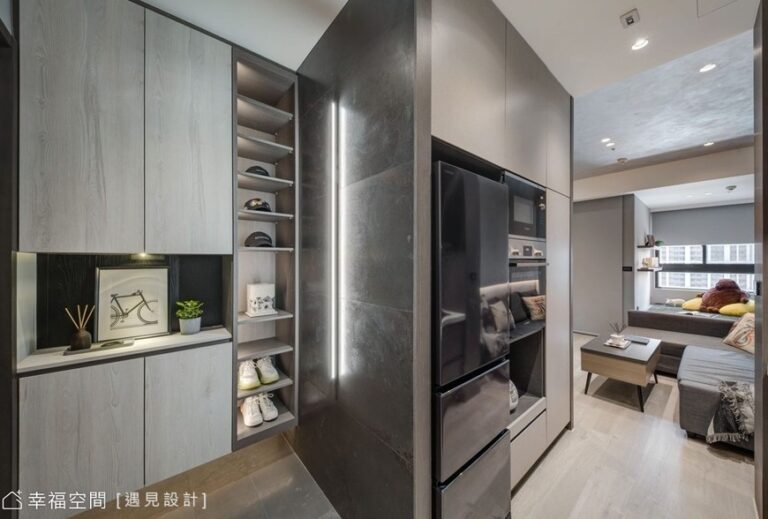 自大門進入,一道延伸至客廳的連續立面,悄然定義空間的基調。透...